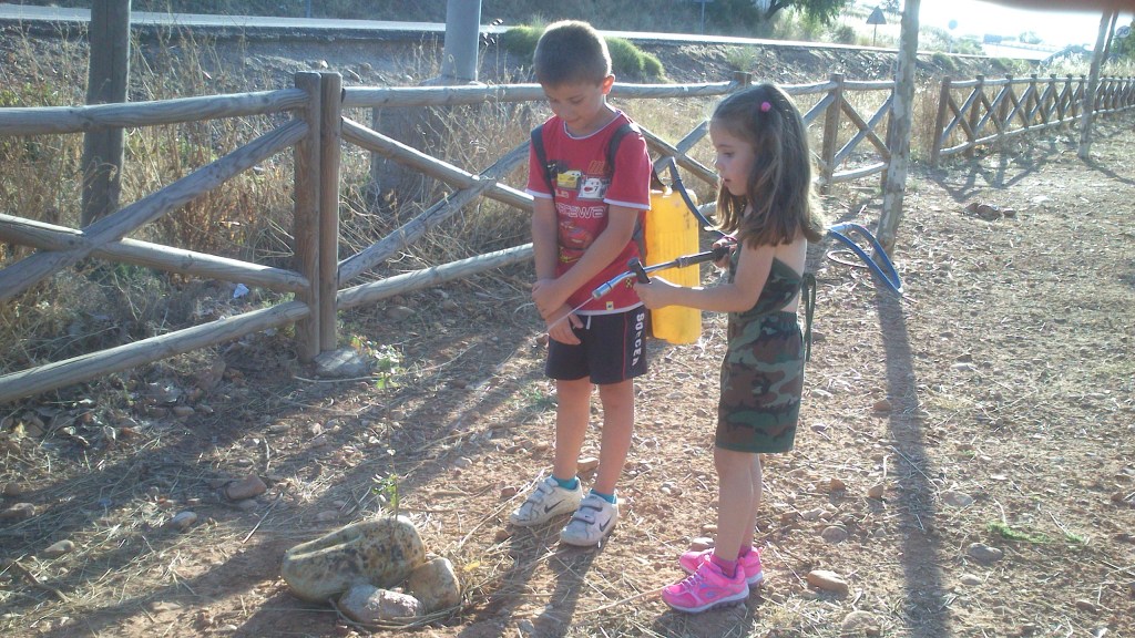 Durante toda la primavera y el verano, entre los trabajadores del ayuntamiento, los vecinos del barrio del Badén y la ayuda de fagusianos como estos pequeños regantes del 8 de agosto de 2014, se han mantenido los riegos para que las plantas sobrevivieran sin problemas.